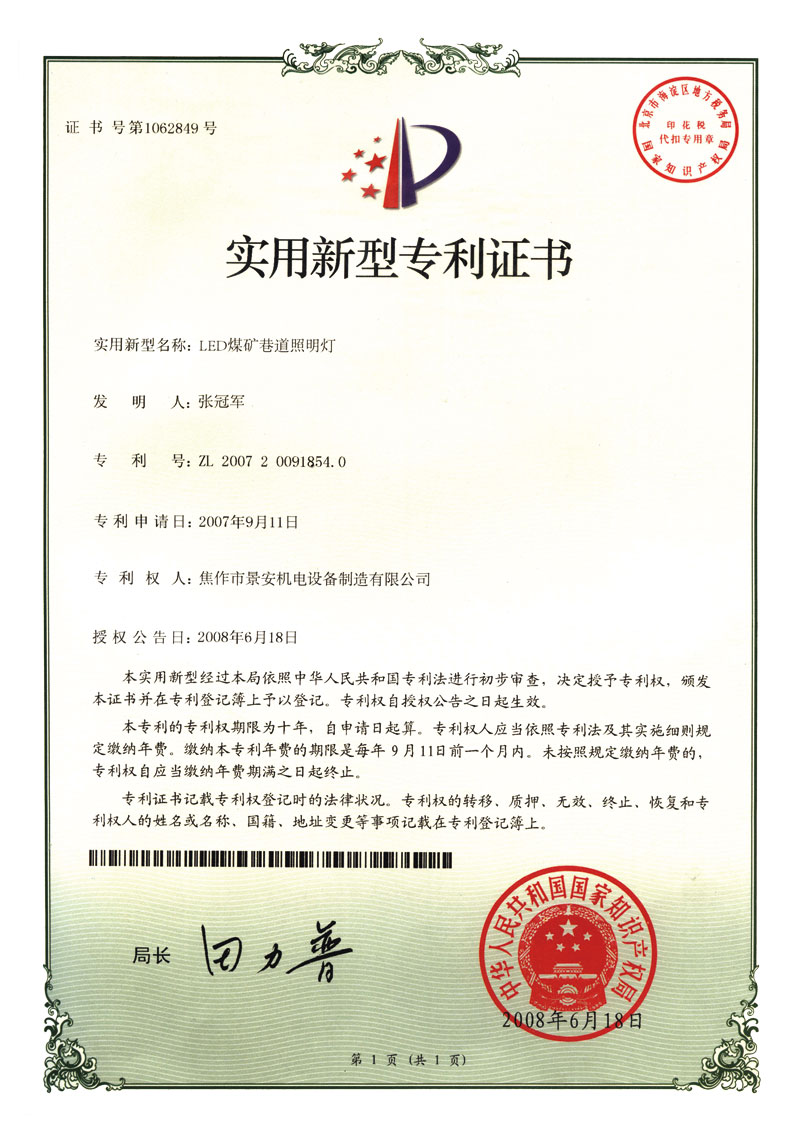 礦用LED隔爆型巷道圓燈專利證書(shū)