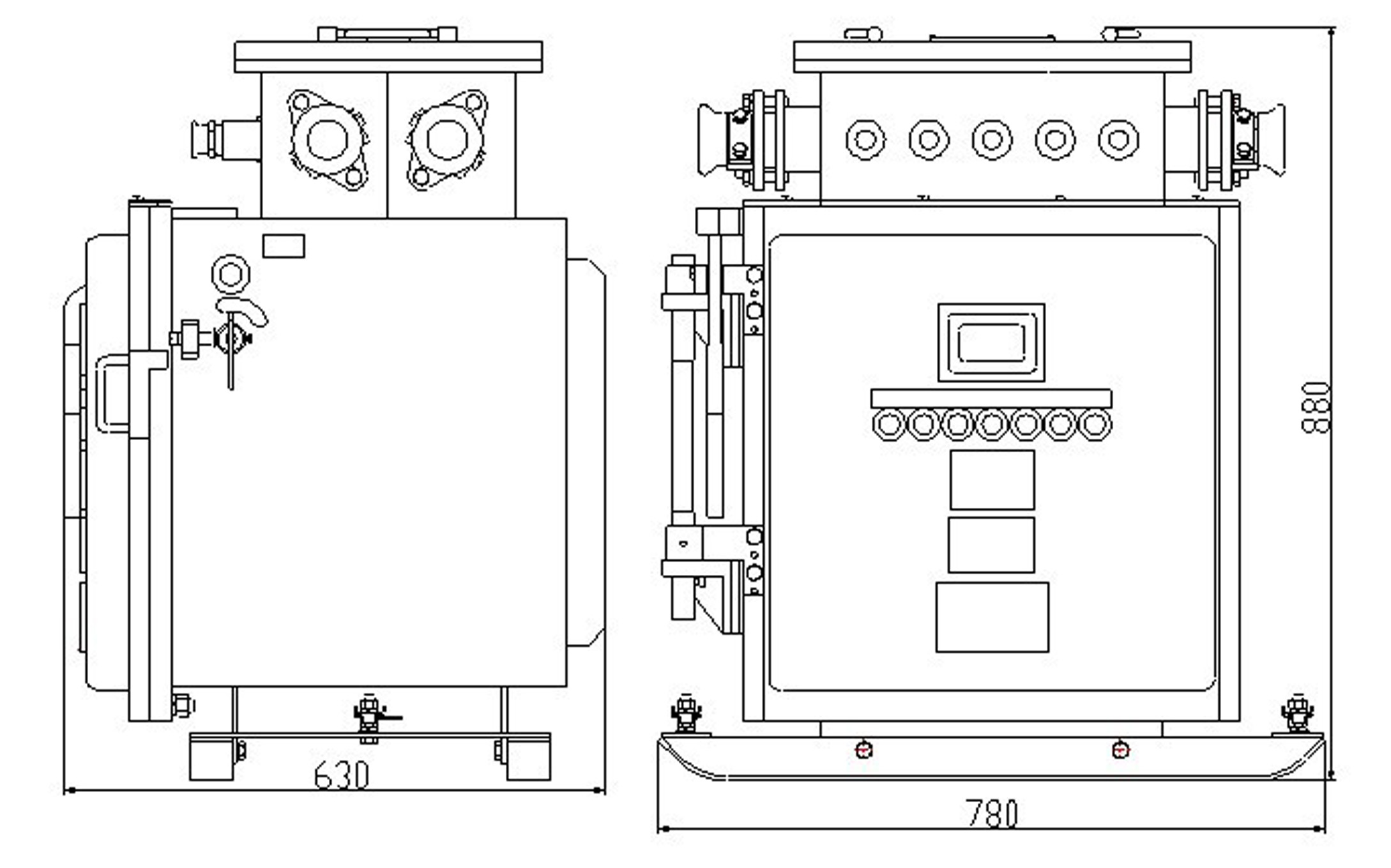 綜合裝置由隔爆外殼、主變壓器和控制部分等組成。隔爆外殼為方形,殼蓋與殼身采用滑動止口結(jié)構(gòu),開啟方便。外殼上部的接線箱作為引進(jìn)和引出電纜用,外殼右側(cè)裝有操作組合開關(guān)的手柄,并有可靠的機械聯(lián)鎖裝置,門蓋上裝有控制按鈕和試驗按鈕,門蓋上有一觀察窗,可以從外面觀察到裝置里面液晶漢顯顯示屏的指示狀態(tài)。殼體內(nèi)的控制部分由控制器件板和真空交流接觸器板組成。在控制器件板上裝有微電腦控制器、液晶顯示屏、電流取樣板、電流傳感器、濾波器、電源控制變壓器、試驗電阻、保險等器件。真空交流接觸器板上裝有真空交流接觸器、管式熔斷器,電流互感器,三相電抗器等器件?刂破骷迮c真空交流接觸器板通過一組航空插件及連線構(gòu)成聯(lián)系。防爆外殼箱體內(nèi)裝有主變壓器。